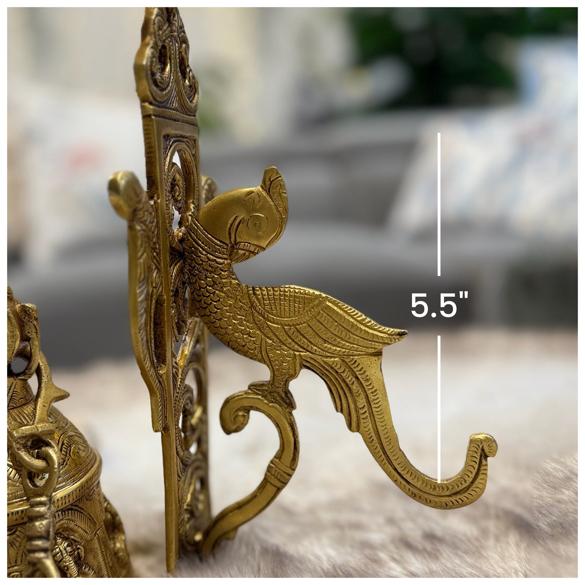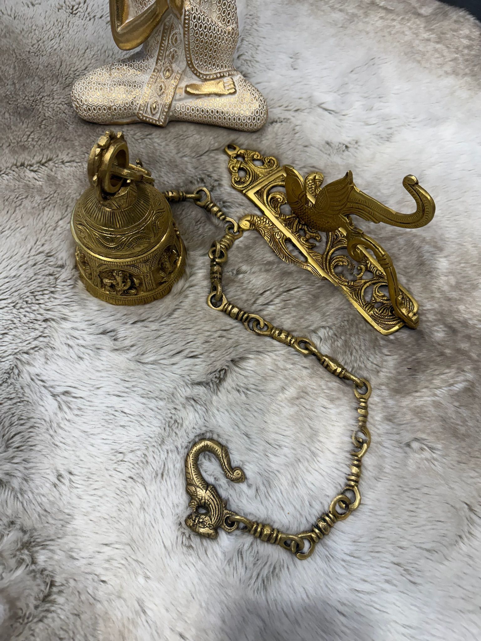 Handcrafted from solid brass, the bell produces a rich, resonant sound when rung, making it ideal for use in puja rooms, meditation corners, entrances, or balconies. Whether used in daily rituals or simply as a decorative accent, it brings an aura of peace and positivity . The bell is gracefully suspended from ornate peacock-shaped hooks, adding a regal and auspicious touch. In Indian tradition, the peacock is a symbol of grace, beauty, and protection , making it the perfect complement to the divine presence of Ganesha.