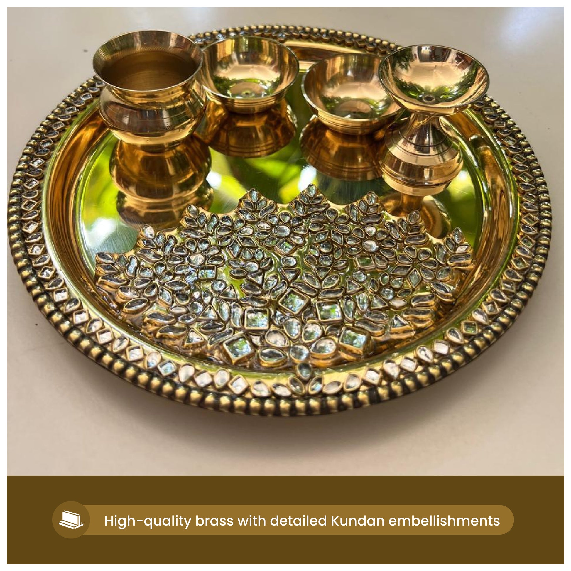 The Brass Thali shines with a golden glow , featuring intricate kundan emblishments on its border and half the surface . Delicate floral and leaf patterns of embedded stones add a royal touch , while a beaded edge completes its elegant finish.