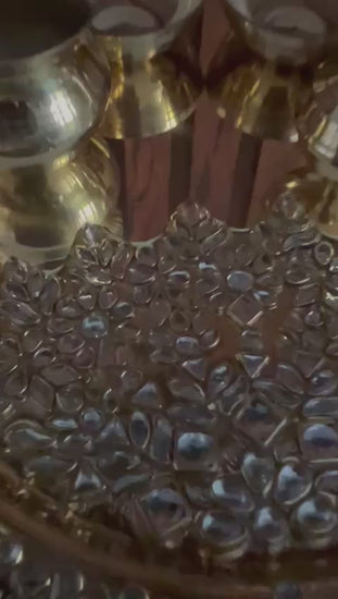 Crafted in gleaming brass and adorned with intricate Kundan work, this Pooja Thali Set is a perfect blend of traditional artistry and spiritual significance. The shimmering stones add a touch of royalty, making every offering feel special and every ritual more divine.