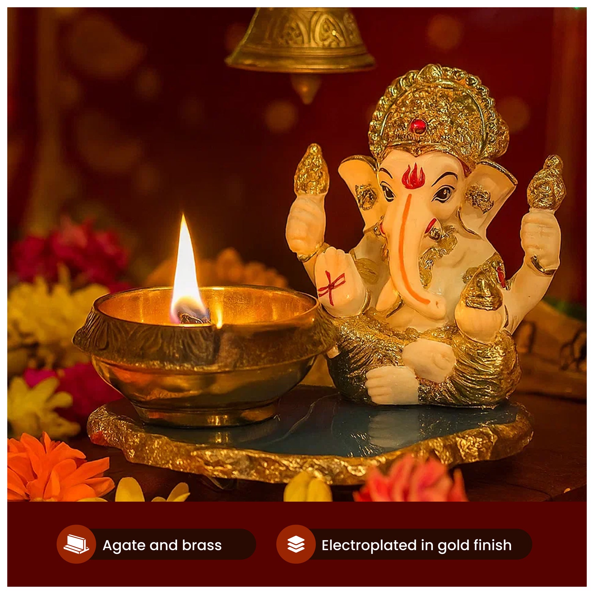 Divine Mukut Ganesha on agate with brass diya on Agate Stone