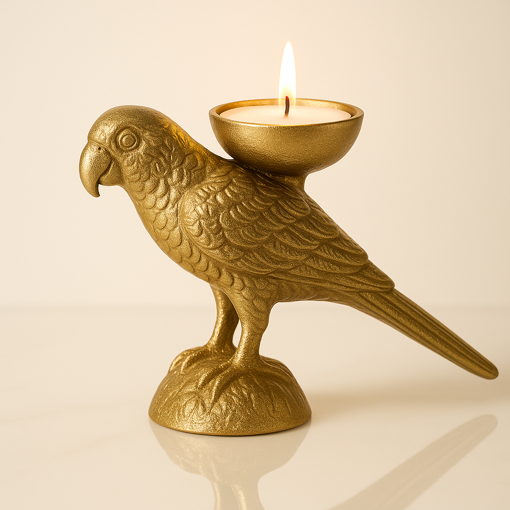 Enhance your decor with this Stunning Parrot Tea Light Holder, expertly crafted from lightweight, durable aluminum with a fine gold finish. Featuring a beautifully detailed parrot perched gracefully, this piece exudes warmth, joy, and cultural charm.